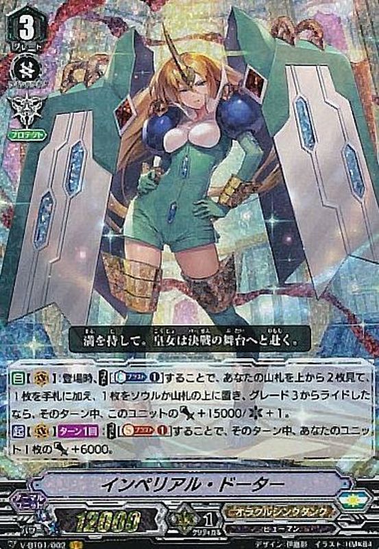 【自】【(V)】:登場時、【コスト】[【カウンターブラスト】(1)]することで、あなたの山札を上から2枚見て、1枚を手札に加え、1枚をソウルか山札の上に置き、グレード3からライドしたなら、そのターン中、このユニットのパワー+15000/クリティカル+1。【起】【(V)】【ターン1回】:【コスト】[【ソウルブラスト】(1)]することで、そのターン中、あなたのユニット1枚のパワー+6000。