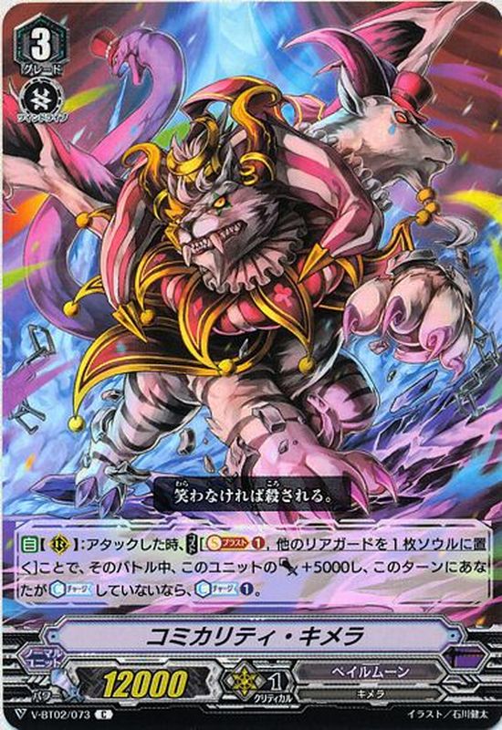 【自】【(R)】:アタックした時、【コスト】[【ソウルブラスト】(1),他のリアガードを1枚ソウルに置く]ことで、そのバトル中、このユニットのパワー+5000し、このターンにあなたが【カウンターチャージ】していないなら、【カウンターチャージ】(1)。