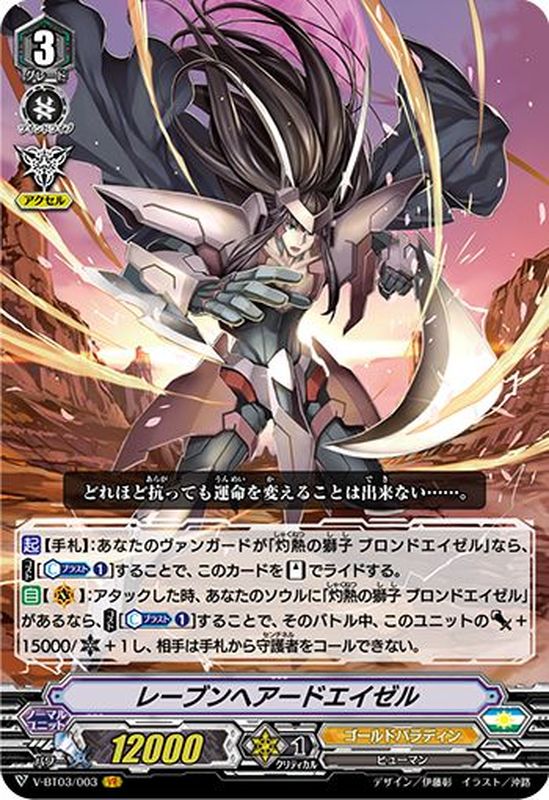 【起】【手札】:あなたのヴァンガードが「灼熱の獅子 ブロンドエイゼル」なら、【コスト】[【カウンターブラスト】(1)]することで、このカードを【スタンド】でライドする。【自】【(V)】:アタックした時、あなたのソウルに「灼熱の獅子 ブロンドエイゼル」があるなら、【コスト】[【カウンターブラスト】(1)]することで、そのバトル中、このユニットのパワー+15000/クリティカル+1し、相手は手札から守護者をコールできない。