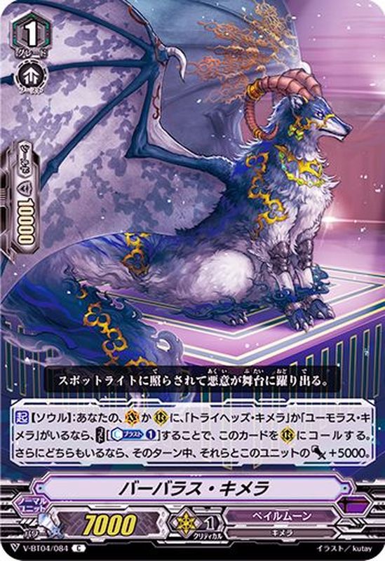 【起】【ソウル】:あなたの、(V)か(R)に、「トライヘッズ・キメラ」か「ユーモラス・キメラ」がいるなら、【コスト】[【カウンターブラスト】(1)]することで、このカードを(R)にコールする。さらにどちらもいるなら、そのターン中、それらとこのユニットのパワー+5000。