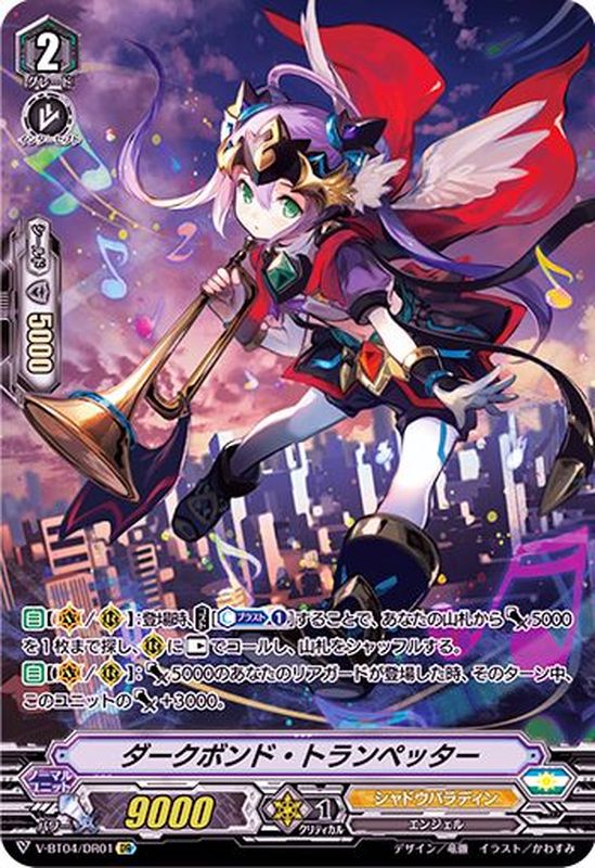 【自】【(V)/(R)】:登場時、【コスト】[【カウンターブラスト】(1)]することで、あなたの山札からパワー5000を1枚まで探し、(R)に【レスト】でコールし、山札をシャッフルする。【自】【(V)/(R)】:パワー5000のあなたのリアガードが登場した時、そのターン中、このユニットのパワー+3000。