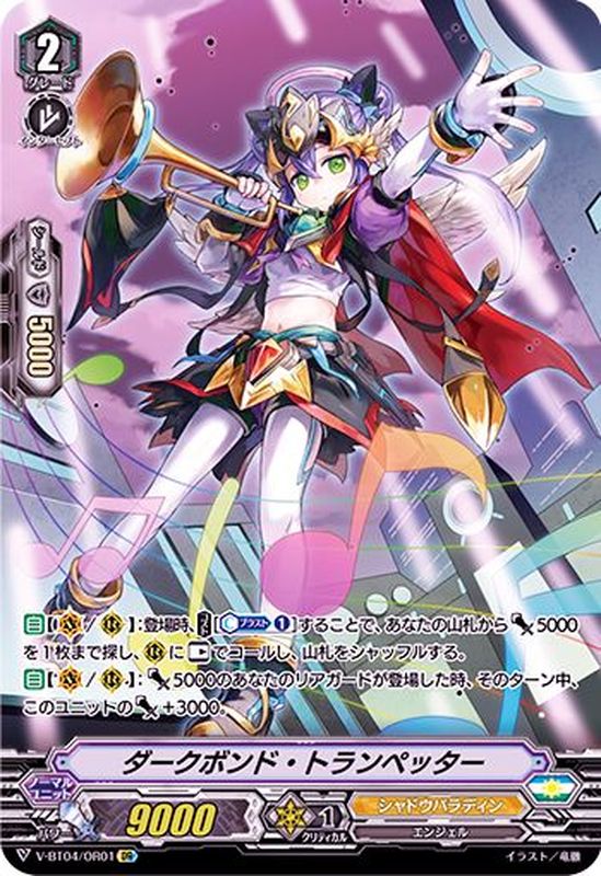【自】【(V)/(R)】:登場時、【コスト】[【カウンターブラスト】(1)]することで、あなたの山札からパワー5000を1枚まで探し、(R)に【レスト】でコールし、山札をシャッフルする。【自】【(V)/(R)】:パワー5000のあなたのリアガードが登場した時、そのターン中、このユニットのパワー+3000。