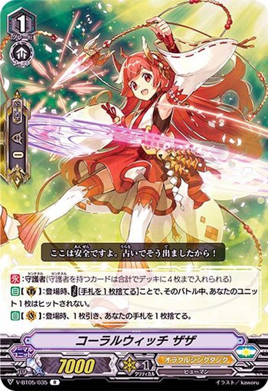 【永】:守護者(守護者を持つカードは合計でデッキに4枚まで入れられる)【自】【(G)】:登場時、【コスト】[手札を1枚捨てる]ことで、そのバトル中、あなたのユニット1枚はヒットされない。【自】【(V)】:登場時、1枚引き、あなたの手札を1枚捨てる。