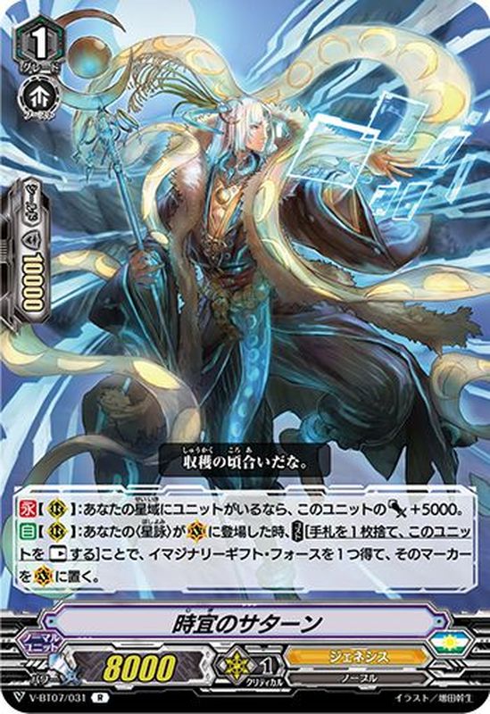 【永】【(R)】:あなたの星域にユニットがいるなら、このユニットのパワー+5000。【自】【(R)】:あなたの〈星詠〉が(V)に登場した時、【コスト】[手札を1枚捨て、このユニットを【レスト】する]ことで、イマジナリーギフト・フォースを1つ得て、そのマーカーを(V)に置く。