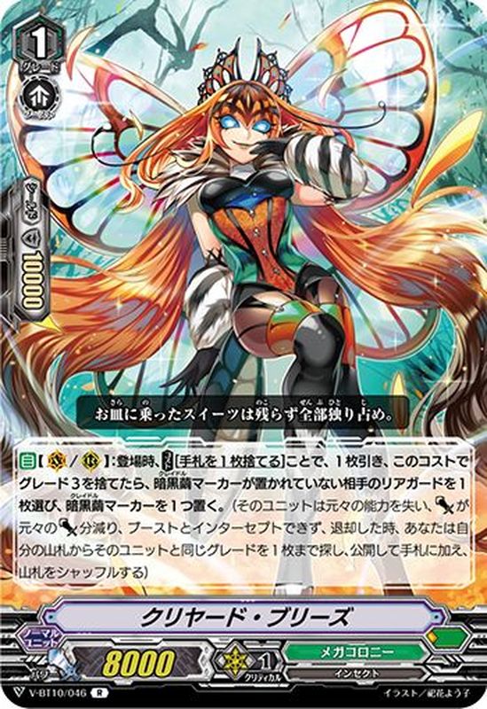 【自】【(V)/(R)】:登場時、【コスト】[手札を1枚捨てる]ことで、1枚引き、このコストでグレード3を捨てたら、暗黒繭マーカーが置かれていない相手のリアガードを1枚選び、暗黒繭マーカーを1つ置く。(そのユニットは元々の能力を失い、パワーが元々のパワー分減り、ブーストとインターセプトできず、退却した時、あなたは自分の山札からそのユニットと同じグレードを1枚まで探し、公開して手札に加え、山札をシャッフルする)