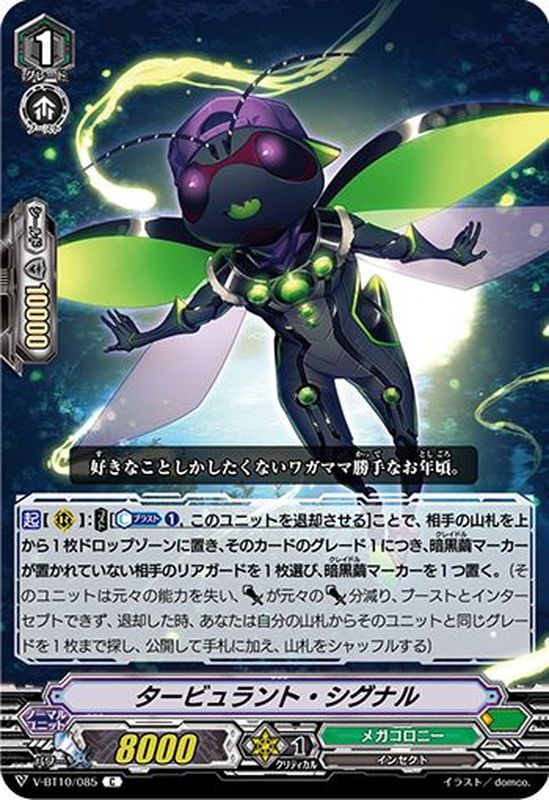 【起】【(R)】:【コスト】[【カウンターブラスト】(1),このユニットを退却させる]ことで、相手の山札を上から1枚ドロップゾーンに置き、そのカードのグレード1につき、暗黒繭マーカーが置かれていない相手のリアガードを1枚選び、暗黒繭マーカーを1つ置く。(そのユニットは元々の能力を失い、パワーが元々のパワー分減り、ブーストとインターセプトできず、退却した時、あなたは自分の山札からそのユニットと同じグレードを1枚まで探し、公開して手札に加え、山札をシャッフルする)