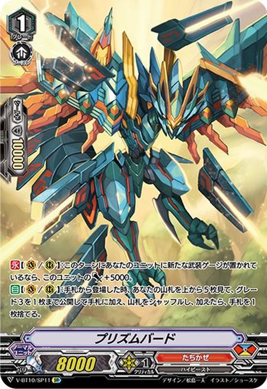 【永】【(V)/(R)】:このターンにあなたのユニットに新たな武装ゲージが置かれているなら、このユニットのパワー+5000。【自】【(V)/(R)】:手札から登場した時、あなたの山札を上から5枚見て、グレード3を1枚まで公開して手札に加え、山札をシャッフルし、加えたら、手札を1枚捨てる。