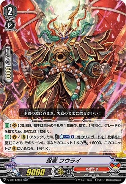 【自】【(V)】:登場時、相手は自分の手札を1枚選び、捨て、1枚引く。グレード0を捨てたら、あなたは1枚引く。【自】【(V)/(R)】:アタックした時、【コスト】[【カウンターブラスト】(1),他のリアガードを1枚手札に戻す]ことで、そのターン中、あなたのユニット1枚のパワー+6000。このユニットが(V)にいるなら、1枚引く。
