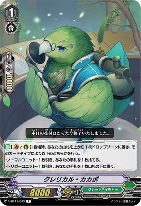 【自】【(V)/(R)】:登場時、あなたの山札を上から1枚ドロップゾーンに置き、そのカードタイプにより以下のどちらかを行う。・ノーマルユニット-1枚引き、あなたの手札を1枚捨てる。・トリガーユニット-1枚引き、あなたの手札を1枚山札の下に置く。