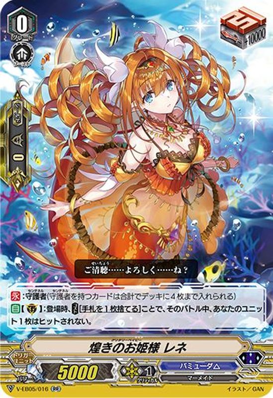 【永】:守護者(守護者を持つカードは合計でデッキに4枚まで入れられる)【自】【(G)】:登場時、【コスト】[手札を1枚捨てる]ことで、そのバトル中、あなたのユニット1枚はヒットされない。