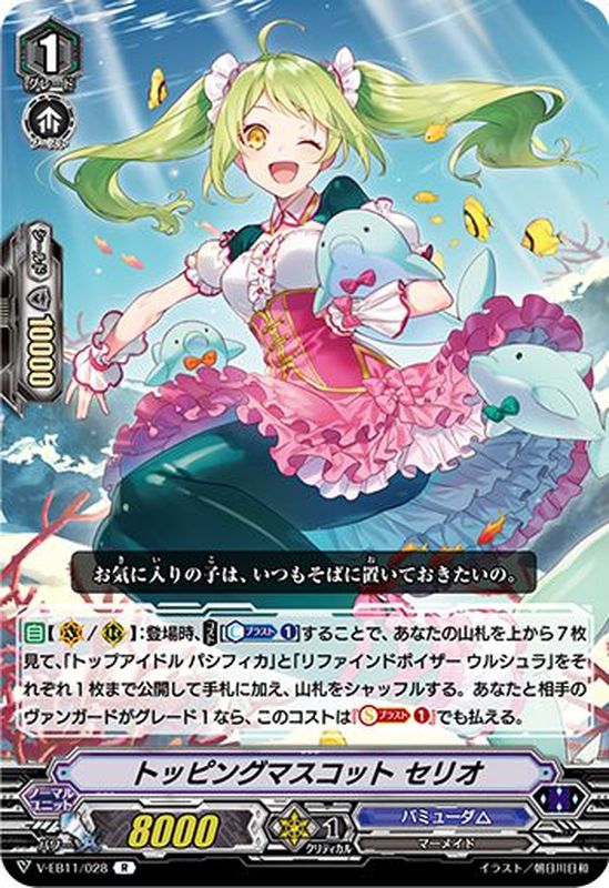 【自】【(V)/(R)】:登場時、【コスト】[【カウンターブラスト】(1)]することで、あなたの山札を上から7枚見て、「トップアイドル パシフィカ」と「リファインドポイザー ウルシュラ」をそれぞれ1枚まで公開して手札に加え、山札をシャッフルする。あなたと相手のヴァンガードがグレード1なら、このコストは『【ソウルブラスト】(1)』でも払える。