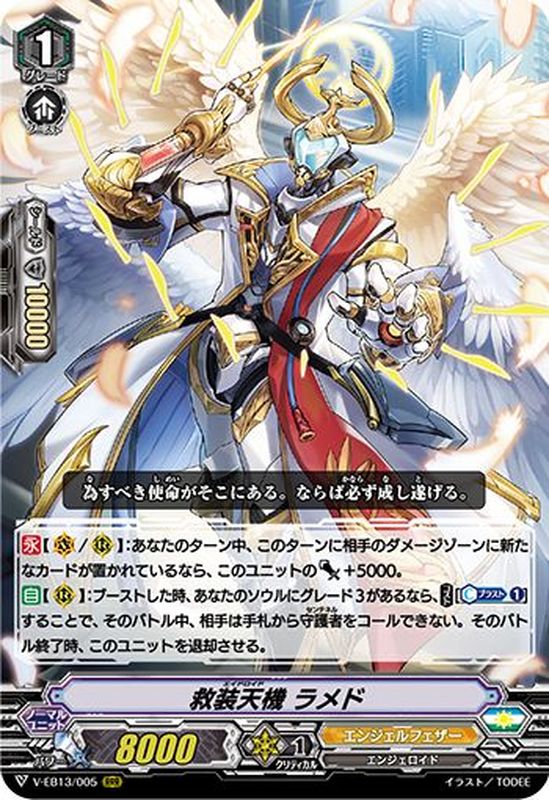 【永】【(V)/(R)】:あなたのターン中、このターンに相手のダメージゾーンに新たなカードが置かれているなら、このユニットのパワー+5000。【自】【(R)】:ブーストした時、あなたのソウルにグレード3があるなら、【コスト】[【カウンターブラスト】(1)]することで、そのバトル中、相手は手札から守護者をコールできない。そのバトル終了時、このユニットを退却させる。