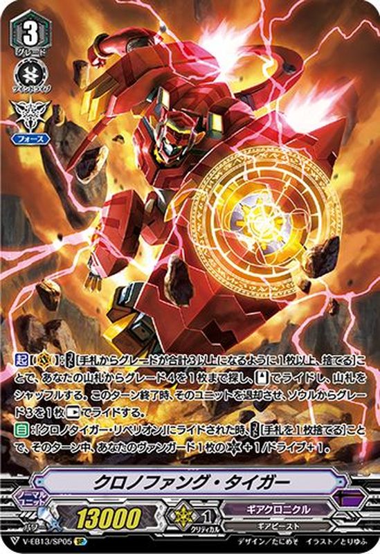 【起】【(V)】:【コスト】[手札からグレードが合計3以上になるように1枚以上、捨てる]ことで、あなたの山札からグレード4を1枚まで探し、【スタンド】でライドし、山札をシャッフルする。このターン終了時、そのユニットを退却させ、ソウルからグレード3を1枚【レスト】でライドする。【自】:「クロノタイガー・リベリオン」にライドされた時、【コスト】[手札を1枚捨てる]ことで、そのターン中、あなたのヴァンガード1枚のクリティカル+1/ドライブ+1。