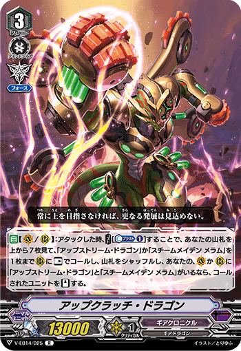 【自】【(V)/(R)】:アタックした時、【コスト】[【カウンターブラスト】(1)]することで、あなたの山札を上から7枚見て、「アップストリーム・ドラゴン」か「スチームメイデン メラム」を1枚まで(R)に【レスト】でコールし、山札をシャッフルし、あなたの、(V)か(R)に「アップストリーム・ドラゴン」と「スチームメイデン メラム」がいるなら、コールされたユニットを【スタンド】する。