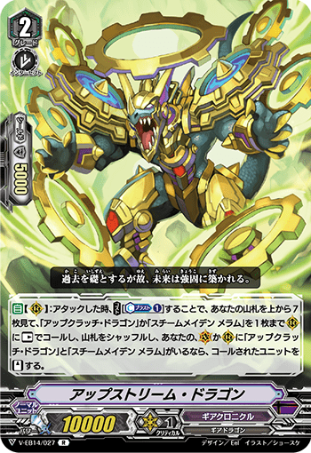 【自】【(R)】:アタックした時、【コスト】[【カウンターブラスト】(1)]することで、あなたの山札を上から7枚見て、「アップクラッチ・ドラゴン」か「スチームメイデン メラム」を1枚まで(R)に【レスト】でコールし、山札をシャッフルし、あなたの、(V)か(R)に「アップクラッチ・ドラゴン」と「スチームメイデン メラム」がいるなら、コールされたユニットを【スタンド】する。