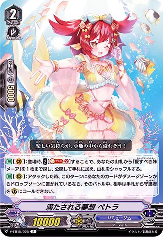 【自】【(V)】:登場時、【コスト】[【ソウルブラスト】(2)]することで、あなたの山札から「愛すべき妹 メーア」を1枚まで探し、公開して手札に加え、山札をシャッフルする。【自】【(R)】:アタックした時、このターンにあなたのカードがダメージゾーンからドロップゾーンに置かれているなら、そのバトル中、相手は手札から守護者を(G)にコールできない。
