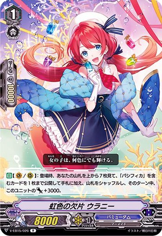 【自】【(V)/(R)】:登場時、あなたの山札を上から7枚見て、「パシフィカ」を含むカードを1枚まで公開して手札に加え、山札をシャッフルし、そのターン中、このユニットのパワー+3000。