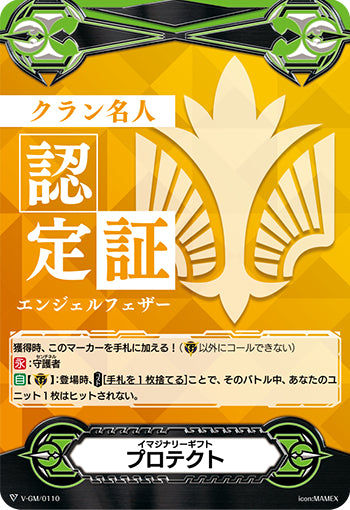 獲得時、このマーカーを手札に加える!((G)以外にコールできない)【永】:守護者【自】【(G)】:登場時、【コスト】[手札を1枚捨てる]ことで、そのバトル中、あなたのユニット1枚はヒットされない。