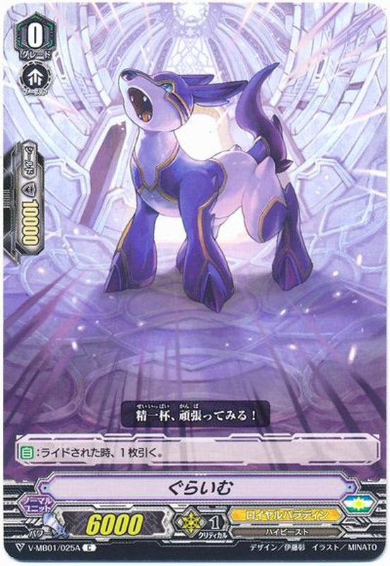 【自】:ライドされた時、1枚引く。さらに、相手のヴァンガードがグレード1以上なら、あなたはクイックシールド・チケットを1枚手札に加える。