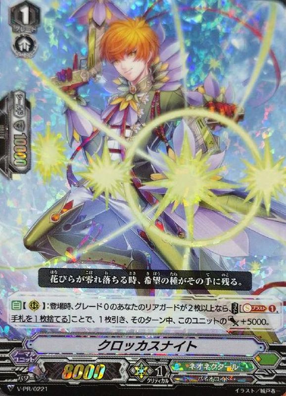 【自】【(R)】:登場時、グレード0のあなたのリアガードが2枚以上なら、【コスト】[【ソウルブラスト】(1),手札を1枚捨てる]ことで、1枚引き、そのターン中、このユニットのパワー+5000。