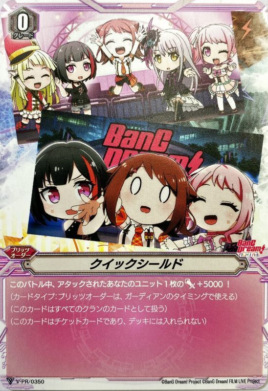 このバトル中、アタックされたあなたのユニット1枚のパワー+5000!(カードタイプ:ブリッツオーダーは、ガーディアンのタイミングで使える)(このカードはすべてのクランのカードとして扱う)(このカードはチケットカードであり、デッキには入れられない)
