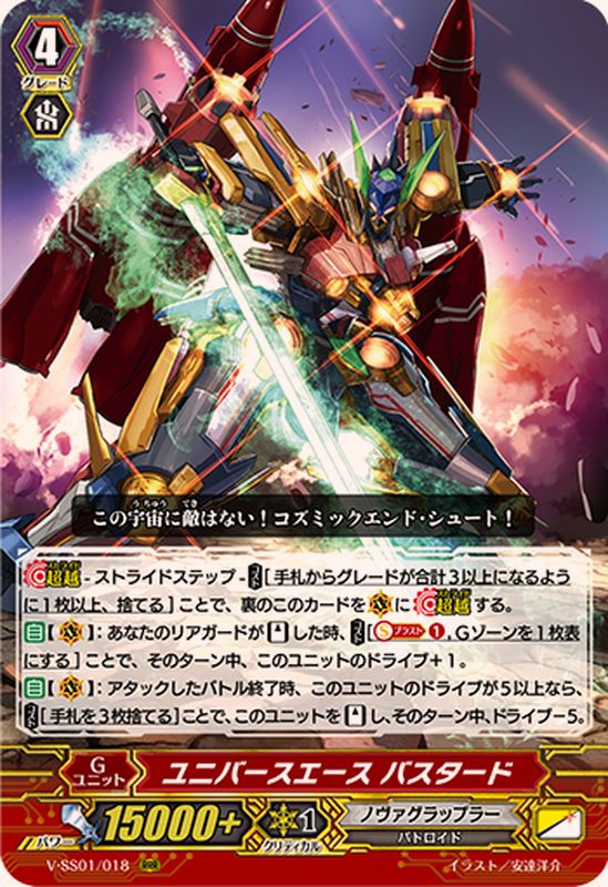 【超越】-ストライドステップ-【コスト】[手札からグレードが合計3以上になるように1枚以上、捨てる]ことで、裏のこのカードを(V)に【超越】する。【自】【(V)】:あなたのリアガードが【スタンド】した時、【コスト】[【ソウルブラスト】(1),Gゾーンを1枚表にする]ことで、そのターン中、このユニットのドライブ+1。【自】【(V)】:アタックしたバトル終了時、このユニットのドライブが5以上なら、【コスト】[手札を3枚捨てる]ことで、このユニットを【スタンド】し、そのターン中、ドライブ-5。