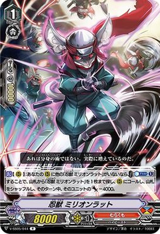 【起】【(R)】:あなたの(R)に他の「忍獣 ミリオンラット」がいないなら、【コスト】[【カウンターブラスト】(1)]することで、山札から「忍獣 ミリオンラット」を1枚まで探し、(R)にコールし、山札をシャッフルし、そのターン中、そのユニットのパワー-4000。