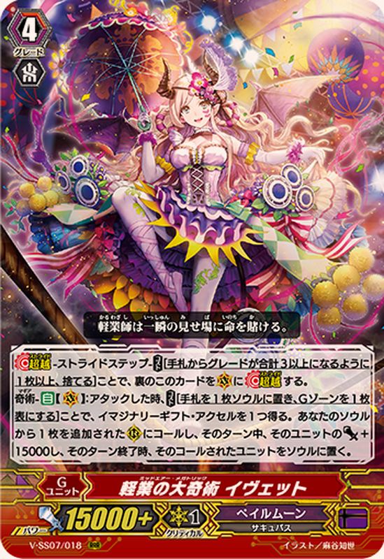 【超越】-ストライドステップ-【コスト】[手札からグレードが合計3以上になるように1枚以上、捨てる]ことで、裏のこのカードを(V)に【超越】する。奇術-【自】【(V)】:アタックした時、【コスト】[手札を1枚ソウルに置き、Gゾーンを1枚表にする]ことで、イマジナリーギフト・アクセルを1つ得る。あなたのソウルから1枚を追加された(R)にコールし、そのターン中、そのユニットのパワー+15000し、そのターン終了時、そのコールされたユニットをソウルに置く。
