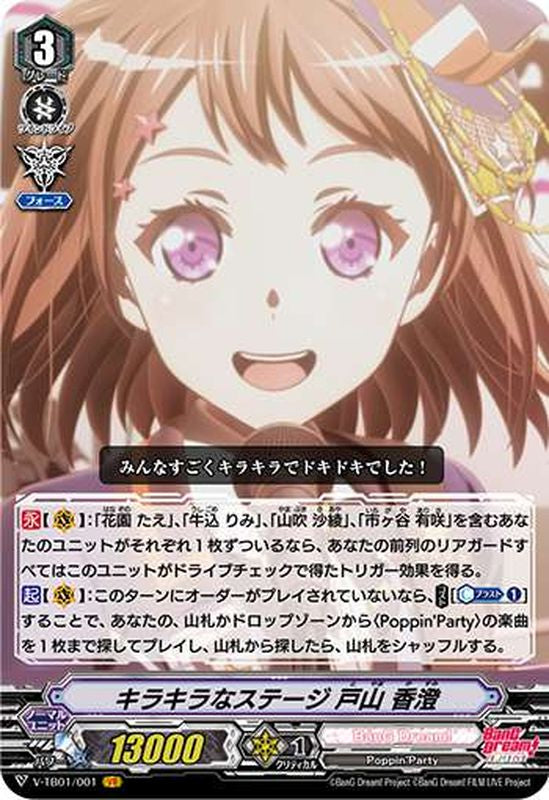【永】【(V)】:「花園 たえ」、「牛込 りみ」、「山吹 沙綾」、「市ヶ谷 有咲」を含むあなたのユニットがそれぞれ1枚ずついるなら、あなたの前列のリアガードすべてはこのユニットがドライブチェックで得たトリガー効果を得る。【起】【(V)】:このターンにオーダーがプレイされていないなら、【コスト】[【カウンターブラスト】(1)]することで、あなたの、山札かドロップゾーンから〈Poppin'Party〉の楽曲を1枚まで探してプレイし、山札から探したら、山札をシャッフルする。