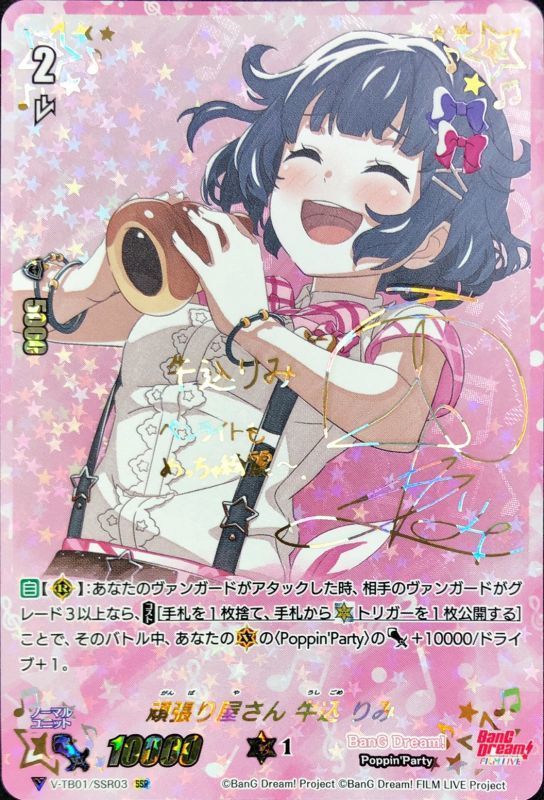 【自】【(R)】:あなたのヴァンガードがアタックした時、相手のヴァンガードがグレード3以上なら、【コスト】[手札を1枚捨て、手札から【クリティカル】トリガーを1枚公開する]ことで、そのバトル中、あなたの(V)の〈Poppin'Party〉のパワー+10000/ドライブ+1。