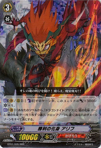 【起】【(V)/(R)】:[【カウンターブラスト】(4)]そのターン中、このユニットのパワー+3000/クリティカル+1。【起】【(V)】:[あなたのソウルから、「ドラゴンナイト アリフ」と「鎧の化身 バー」と「槍の化身 ター」を1枚ずつ選び、ドロップゾーンに置く]あなたのダメージゾーンをすべて表にする。