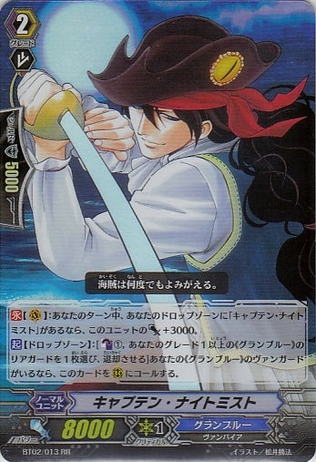【永】【(V)】:あなたのターン中、あなたのドロップゾーンに「キャプテン・ナイトミスト」があるなら、このユニットのパワー+3000。【起】【ドロップゾーン】:[【カウンターブラスト】(1),あなたのグレード1以上の《グランブルー》のリアガードを1枚選び、退却させる]あなたの《グランブルー》のヴァンガードがいるなら、このカードを(R)にコールする。