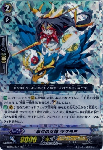 【自】:このユニットが(V)に登場した時、あなたのソウルに「三日月の女神ツクヨミ」と「神鷹 一拍子」があるなら、【ソウルチャージ】(2)してよい。【自】【(V)】:あなたのライドフェイズ開始時、あなたの山札の上から5枚見て、「満月の女神ツクヨミ」を1枚まで探し、ライドし、残りのカードを山札の下に好きな順番で置く。ライドしたら、そのライドフェイズ中、あなたはノーマルライドできない。