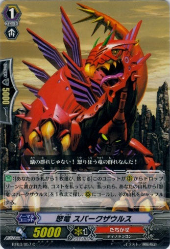 【自】:[あなたの手札から1枚選び、捨てる]このユニットが(R)からドロップゾーンに置かれた時、コストを払ってよい。払ったら、あなたの山札から「怒竜 スパークザウルス」を1枚まで探し、(R)にコールし、その山札をシャッフルする