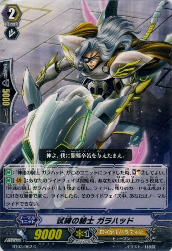 【自】:「神速の騎士 ガラハッド」がこのユニットにライドした時、【ソウルチャージ】(2)してよい。【自】【(V)】:あなたのライドフェイズ開始時、あなたの山札の上から5枚見て、「神速の騎士 ガラハッド」を1枚まで探し、ライドし、残りのカードを山札の下に好きな順番で置く。ライドしたら、そのライドフェイズ中、あなたはノーマルライドできない。