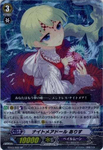 【自】【(R)】:[【カウンターブラスト】(1),このユニットをソウルに置く]このユニットのアタックがヒットした時、あなたの《ペイルムーン》のヴァンガードがいるなら、コストを払ってよい。払ったら、あなたのソウルから「ナイトメアドール ありす」以外の《ペイルムーン》を1枚選び、(R)にコールする。