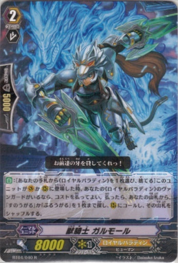 【自】:[あなたの手札から《ロイヤルパラディン》を1枚選び、捨てる]このユニットが(V)か(R)に登場した時、あなたの《ロイヤルパラディン》のヴァンガードがいるなら、コストを払ってよい。払ったら、あなたの山札から、「すのうがる」か「ぶるうがる」を1枚まで探し、(R)にコールし、その山札をシャッフルする。