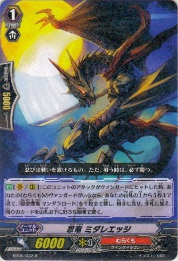 【自】【(V)/(R)】:このユニットのアタックがヴァンガードにヒットした時、あなたの《むらくも》のヴァンガードがいるなら、あなたの山札の上から5枚まで見て、「隠密魔竜 マンダラロード」を1枚まで探し、相手に見せ、手札に加え、残りのカードを山札の下に好きな順番で置く。