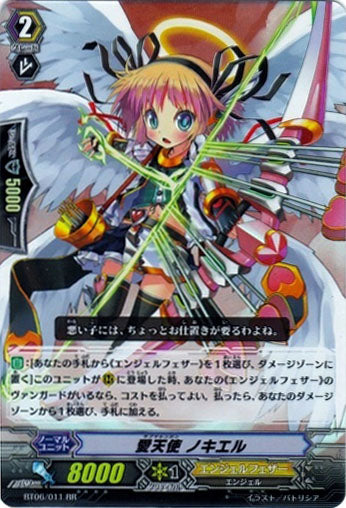 【自】:[あなたの手札から《エンジェルフェザー》を1枚選び、ダメージゾーンに置く]このユニットが(R)に登場した時、あなたの《エンジェルフェザー》のヴァンガードがいるなら、コストを払ってよい。払ったら、あなたのダメージゾーンから1枚選び、手札に加える。
