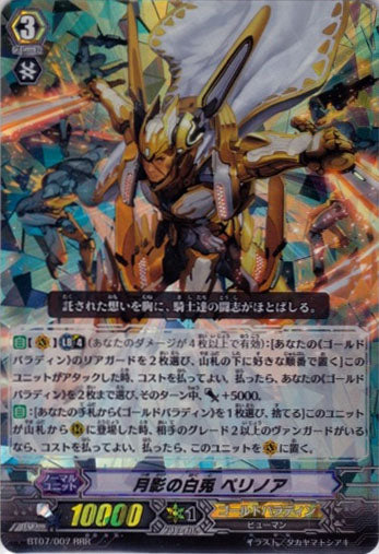 【自】【(V)】【リミットブレイク】(4)(あなたのダメージが4枚以上で有効):[あなたの《ゴールドパラディン》のリアガードを2枚選び、山札の下に好きな順番で置く]このユニットがアタックした時、コストを払ってよい。払ったら、あなたの《ゴールドパラディン》を2枚まで選び、そのターン中、パワー+5000。【自】:[あなたの手札から《ゴールドパラディン》を1枚選び、捨てる]このユニットが山札から(R)に登場した時、相手のグレード2以上のヴァンガードがいるなら、コストを払ってよい。払ったら、このユニットを(V)に置く。
