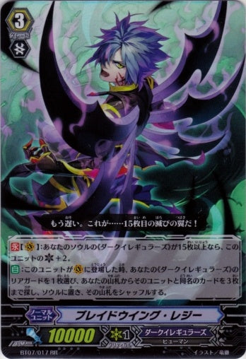 【永】【(V)】:あなたのソウルの《ダークイレギュラーズ》が15枚以上なら、このユニットのクリティカル+2。【自】:このユニットが(V)に登場した時、あなたの《ダークイレギュラーズ》のリアガードを1枚選び、あなたの山札からそのユニットと同名のカードを3枚まで探し、ソウルに置き、その山札をシャッフルする。