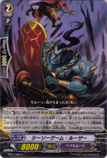 【自】:[【カウンターブラスト】(1)]このユニットが(V)か(R)に登場した時、あなたの《ペイルムーン》のヴァンガードがいるなら、コストを払ってよい。払ったら、あなたの山札の上から1枚をダメージゾーンに置き、そのターンのエンドフェイズ開始時、あなたのダメージゾーンから1枚選び、山札に戻し、その山札をシャッフルする。