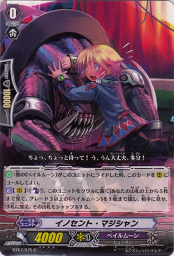 【自】:他の《ペイルムーン》がこのユニットにライドした時、このカードを(R)にコールしてよい。【起】【(R)】:[【カウンターブラスト】(1),このユニットをソウルに置く]あなたの山札の上から5枚まで見て、グレード3以上の《ペイルムーン》を1枚まで探し、相手に見せ、手札に加え、その山札をシャッフルする。
