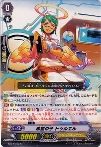 【自】:他の《エンジェルフェザー》がこのユニットにライドした時、このカードを(R)にコールしてよい。【永】【(R)】:あなたの《エンジェルフェザー》のヴァンガードがいるなら、このユニットは、『【起】【(R)】:[【カウンターブラスト】(1),このユニットをソウルに置く,あなたの手札から《エンジェルフェザー》を1枚選び、ダメージゾーンに置く]あなたのダメージゾーンから1枚選び、手札に加える。』を得る。