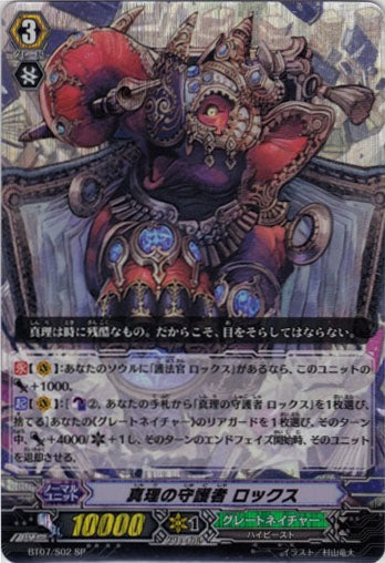 【永】【(V)】:あなたのソウルに「護法官 ロックス」があるなら、このユニットのパワー+1000。【起】【(V)】:[【カウンターブラスト】(2),あなたの手札から「真理の守護者 ロックス」を1枚選び、捨てる]あなたの《グレートネイチャー》のリアガードを1枚選び、そのターン中、パワー+4000/クリティカル+1し、そのターンのエンドフェイズ開始時、そのユニットを退却させる。