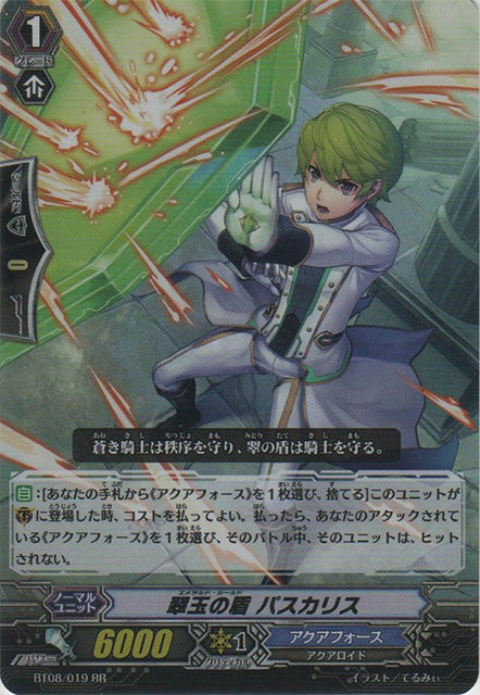 【永】:守護者(守護者はデッキに4枚までしか入れることができない)【自】:[あなたの手札から《アクアフォース》を1枚選び、捨てる]このユニットが(G)に登場した時、コストを払ってよい。払ったら、あなたのアタックされている《アクアフォース》を1枚選び、そのバトル中、そのユニットは、ヒットされない。