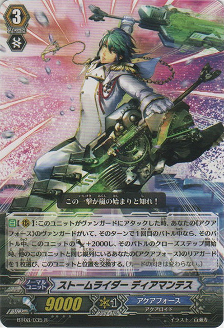 【自】【(R)】:このユニットがヴァンガードにアタックした時、あなたの《アクアフォース》のヴァンガードがいて、そのターンで1回目のバトル中なら、そのバトル中、このユニットのパワー+2000し、そのバトルのクローズステップ開始時、他のこのユニットと同じ縦列にいるあなたの《アクアフォース》のリアガードを1枚選び、このユニットと位置を交換する。(カードの向きは変わらない。)
