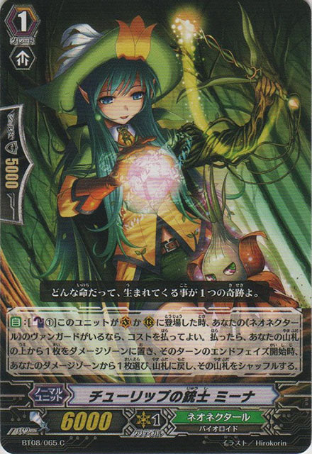【自】:[【カウンターブラスト】(1)]このユニットが(V)か(R)に登場した時、あなたの《ネオネクタール》のヴァンガードがいるなら、コストを払ってよい。払ったら、あなたの山札の上から1枚をダメージゾーンに置き、そのターンのエンドフェイズ開始時、あなたのダメージゾーンから1枚選び、山札に戻し、その山札をシャッフルする。