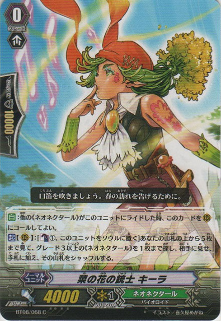 【自】:他の《ネオネクタール》がこのユニットにライドした時、このカードを(R)にコールしてよい。【起】【(R)】:[【カウンターブラスト】(1),このユニットをソウルに置く]あなたの山札の上から5枚まで見て、グレード3以上の《ネオネクタール》を1枚まで探し、相手に見せ、手札に加え、その山札をシャッフルする。