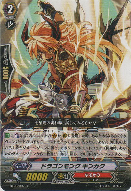 【自】:[【カウンターブラスト】(1)]このユニットが(V)か(R)に登場した時、あなたの《なるかみ》のヴァンガードがいるなら、コストを払ってよい。払ったら、あなたの山札の上から1枚をダメージゾーンに置き、そのターンのエンドフェイズ開始時、あなたのダメージゾーンから1枚選び、山札に戻し、その山札をシャッフルする。